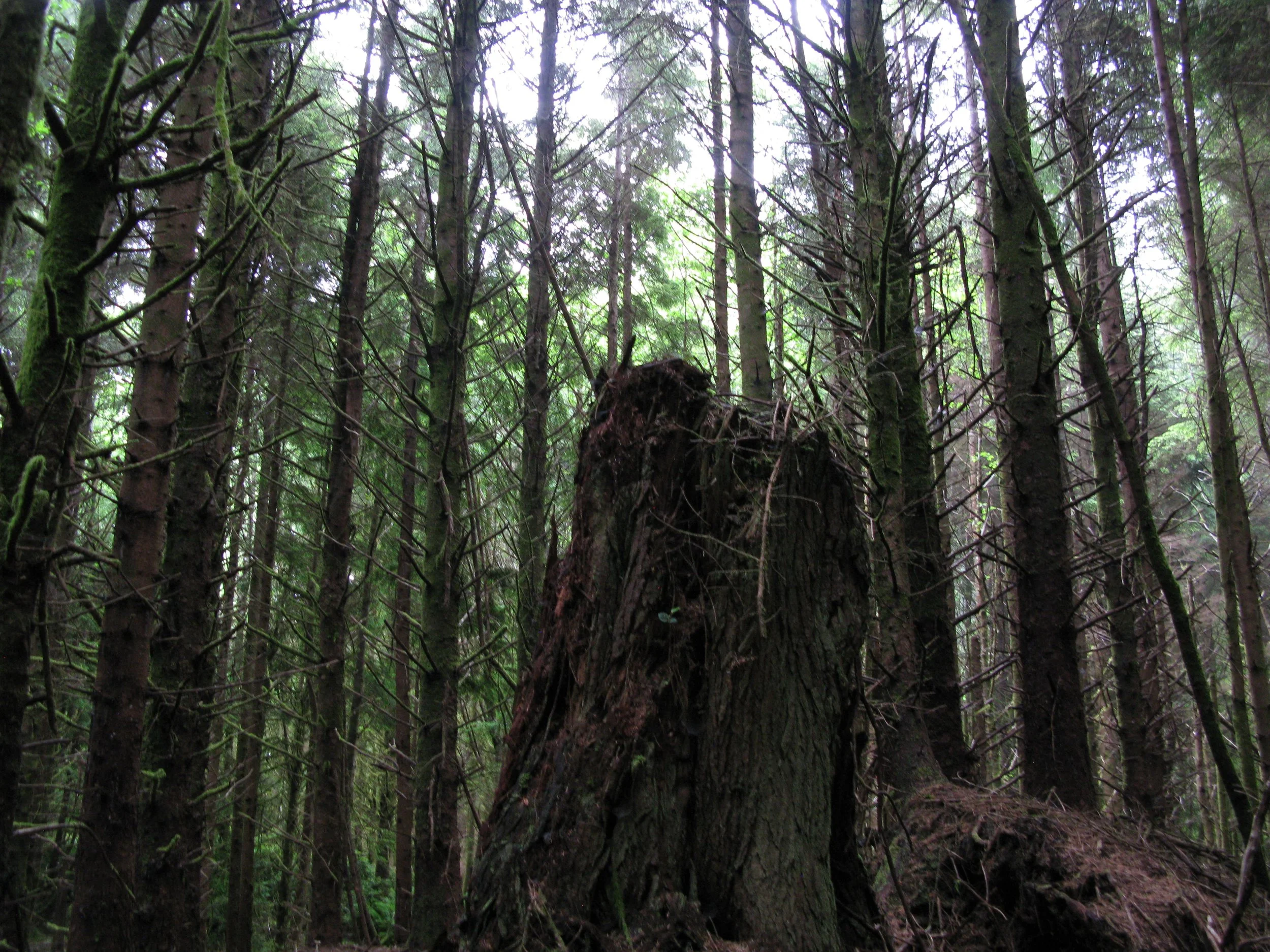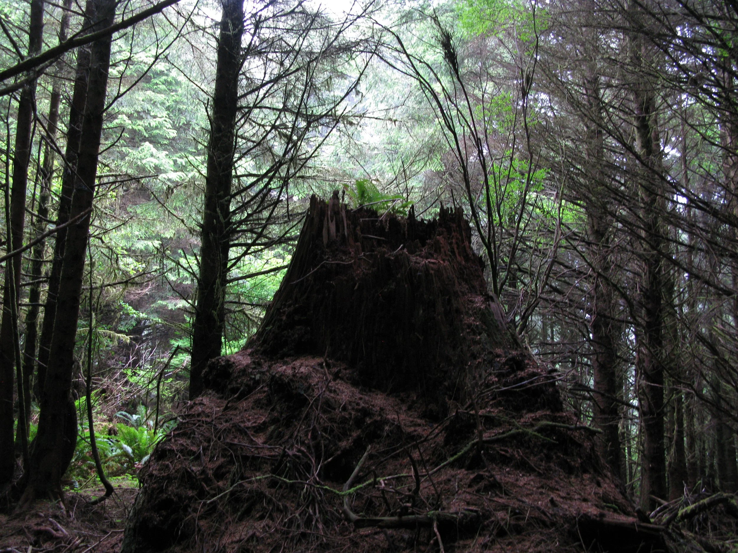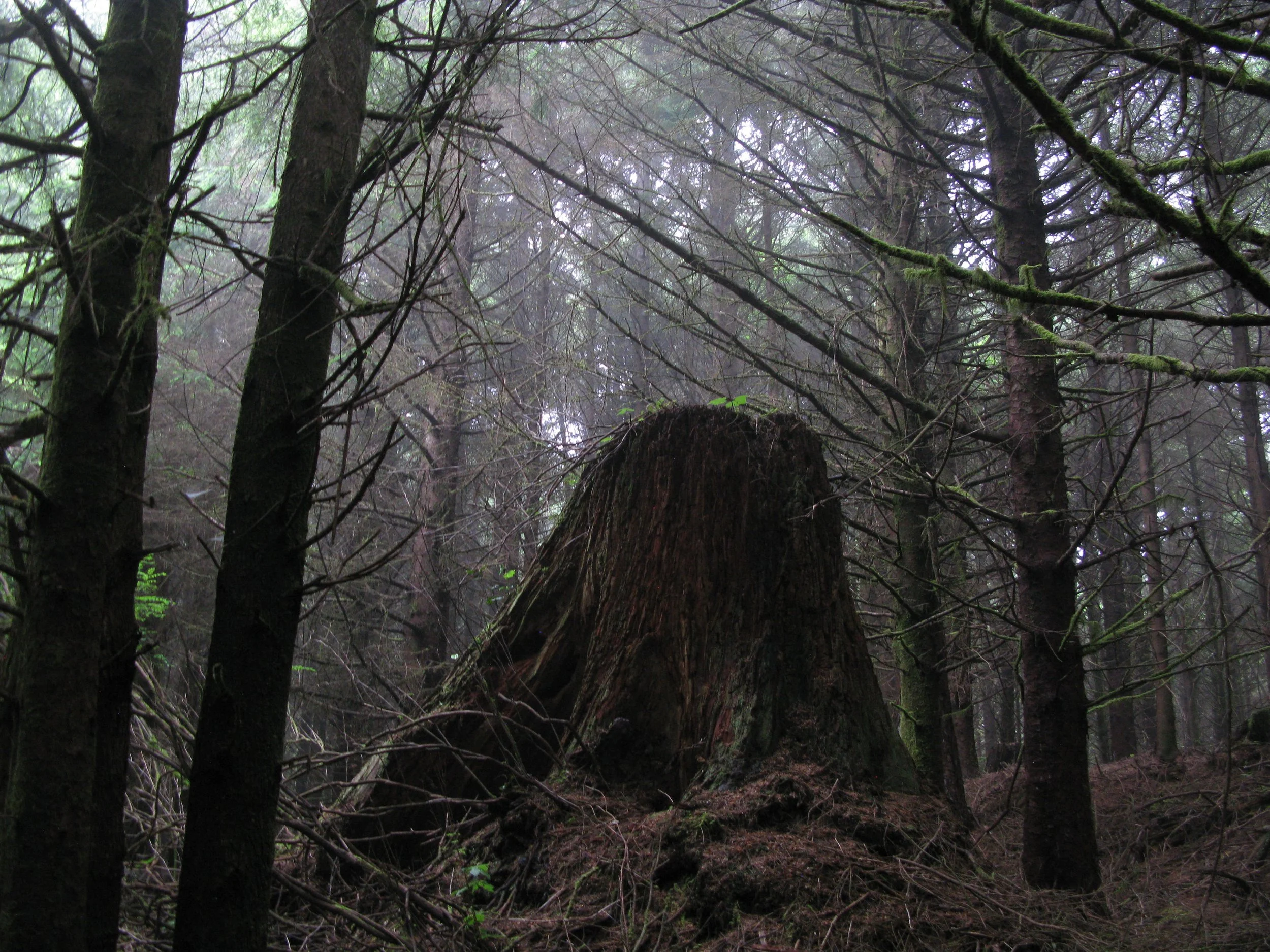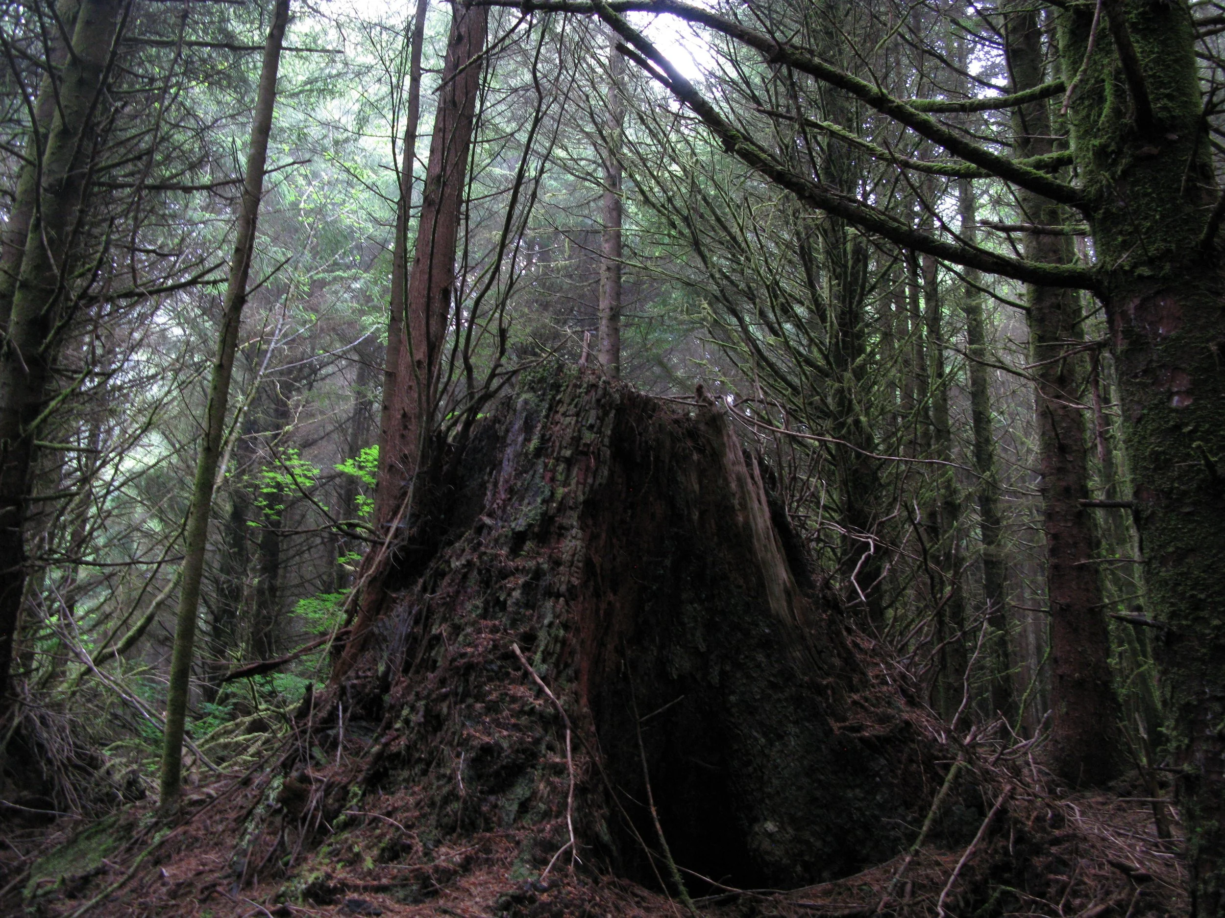 For the last hundred years or so these monolithic stumps have basked in the light that their foliage used to block out. That ray of light that shines in the canopy from the loss of such a large shade leads to enhanced growth for the vegetation that happened to germinate in that area. A flourish of bright green in forest of otherwise dark hues.